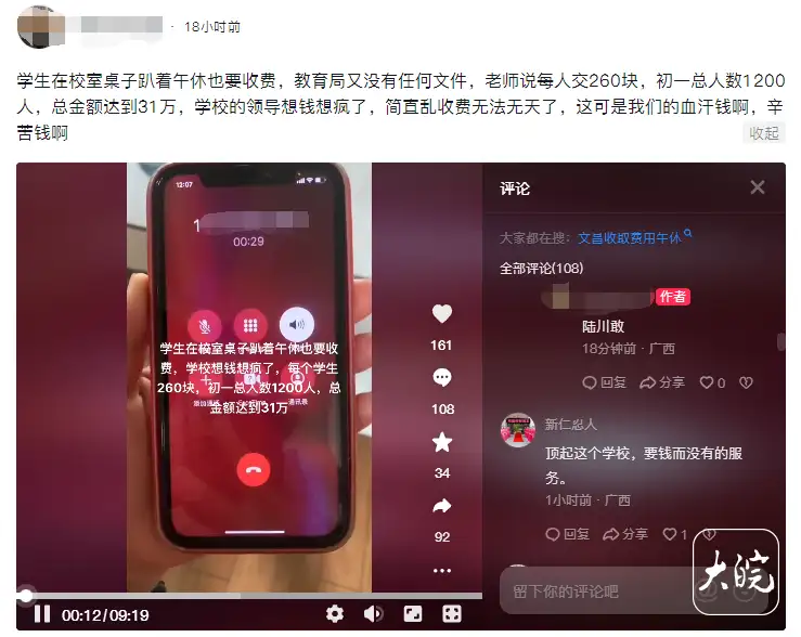 大皖新闻记者注意到,该学生家长发布了一段长达9分钟的与学校老师通话谈论午休收费的录音,并配文,“学生在校室桌子趴着午休也要收费,教育局又没有任何文件,老师说每人交260块。”
