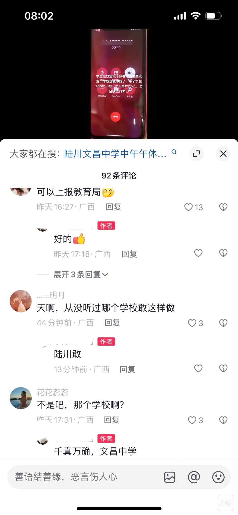 大皖新闻记者终于联系到视频发布者李大姐。她告诉记者,收费的学校为陆川中学附属初级中学。“我家孩子今年13岁,在里面上初一。”李大姐向记者证实,录音视频就是她本人发布的,电话中的老师就是孩子班级的班主任。