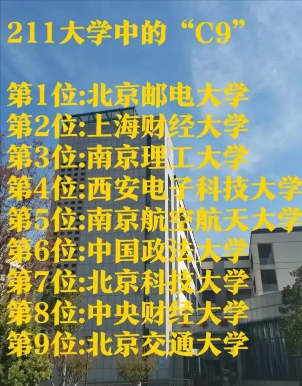然而,最近有媒体将以下211工程大学列入211中的C9名校。包括北京邮电大学、上海财经大学、南京理工大学、西安电子科技大学、南京航空航天大学、中国政法大学、北京科技大学、中央财经大学和北京交通大学。