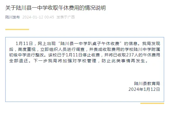 回应中称,1月11日,网上出现“陆川县一中学趴桌子午休收费”的信息。我局发现后,高度重视,立即组织人员进行调查,并责成收取费用的学校陆川中学附属初级中学进行整改。该校已于1月11日停止收费,并将已收取237人的午休费用全部退还。下一步我局将加强对学校管理,防止此类事情再发生