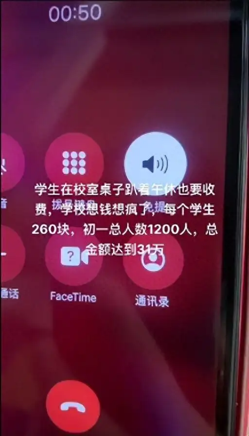 网传视频中显示一个正在通话的手机屏幕,手机屏幕显示对方的电话号码为188开头,对方通话者的身份疑似学校老师,对方表示,“因为这个学期是5个月,所以也没收那么多,按260元收,就是260除以180也就是一块两块一天的。”