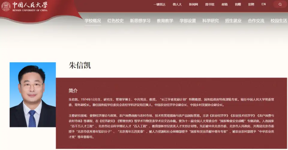 朱信凯(资料图 来源:中国人民大学网站)