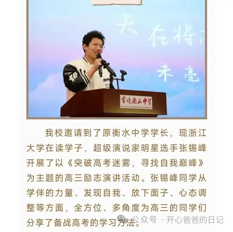 2年过去了,当初的张锡峰考上了浙江大学,他实现了人生的跃迁,摆在他面前的是更新的平台,更大的世界,以及更多的美好。而后他也陆续出现在了一些高中里,作为成功的代表讲述自己的心路历程,用自己的亲身经历激励着更多的孩子们向阳而生。