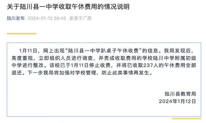 记者从广西陆川县教育局获悉,1月11日,关于网上出现“陆川县一中学趴桌子午休收费”的情况,陆川县立即组织人员进行调查,并责成收取费用的学校陆川中学附属初级中学进行整改。该校已于1月11日停止收费,并将已收取237人的午休费用全部退还。陆川县教育局表示,下一步将加强对学校管理,防止此类事情再发生。