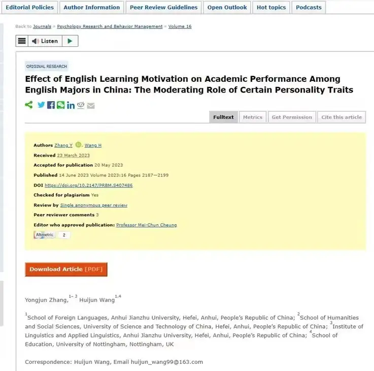大皖新闻讯 研究生期间做项目发论文很常见,那本科呢?记者从安徽建筑大学获悉,该校外国语学院英语专业的2018级本科生在SSCI收录期刊Psychology Research and Behavior Management发表了学术论文,研究发现得到国际同行较高评价和肯定。1月10日,大皖新闻记者采访到了论文的作者汪慧俊和指导老师张永军,听他们讲述这一成果的研究过程和其科研心得。
