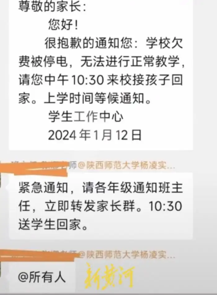 据网友发布的视频内容显示,1月12日上午,陕师大杨凌实验中学学生工作中心向学生家长发布了一则“紧急通知”。通知内容显示:学校欠费被停电,无法进行正常教学,请您中(上)午10点30分来校接孩子回家,上学时间等候通知。此外,在另一张聊天记录截图中,标注有该校名称的某位老师发布消息称,“紧急通知,请各年级通知班主任,立即转发家长群,10点30分送学生回家。”