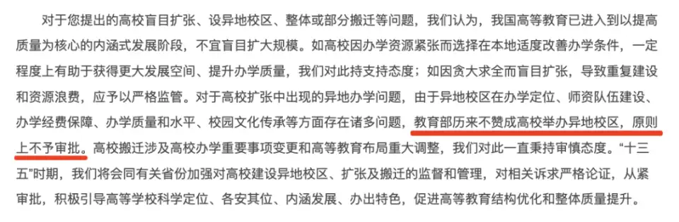 早在2017年,教育部就曾表态,“原则上不支持、不鼓励跨城市、跨省建设新校区,特别是具有本科教学功能的新校区”;2019年,教育部再次明确,“历来不赞成高校举办异地校区,原则上不予审批”。