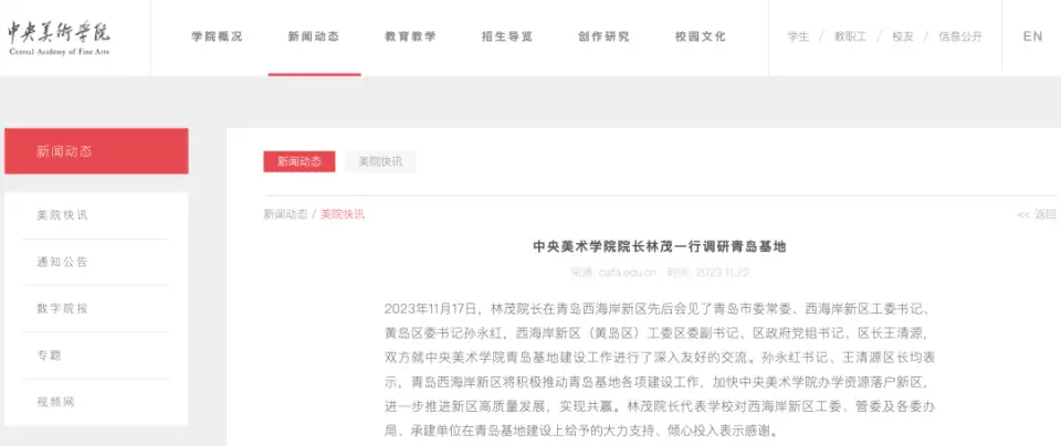 图丨2023年11月,中央美术学院官网消息显示,青岛校区已更名“青岛基地”