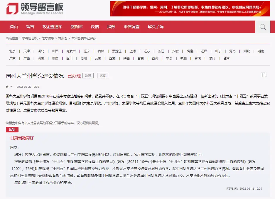 2022年3月,甘肃省教育厅在人民网领导留言板回复,就中国科学院大学兰州分院办学情况,省教育厅分管负责同志和相关业务部门曾专题赴教育部当面沟通,收到“不支持也不鼓励”的明确反馈。后续回复中,当地已向与合作创建甘肃科技大学等设想进行努力。