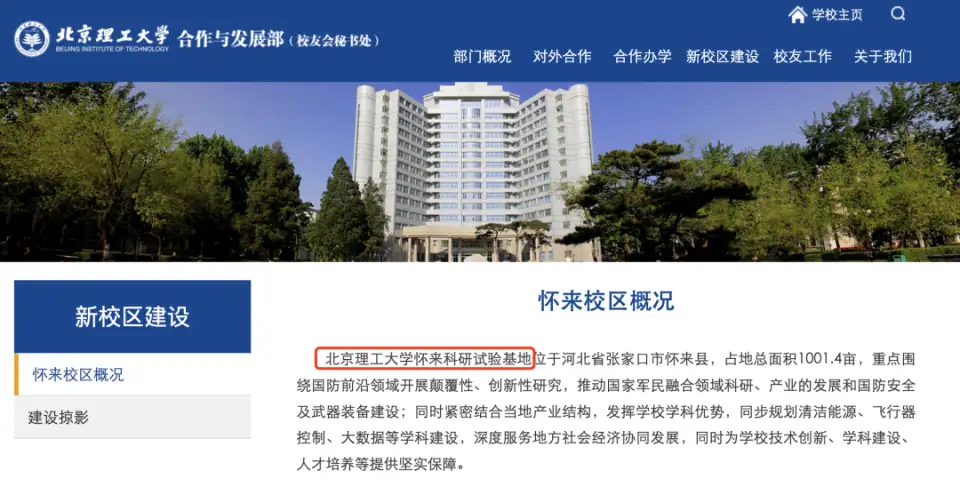 近日,据青塔查阅发现,北京理工大学官网对于怀来校区的相关介绍中,名称已变更为“北京理工大学怀来科研试验基地”。