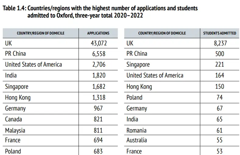 而顺利获得牛津大学录取的人数为500人,平均每年录取中国大陆学生166人。录取率约为7.6%,同比下降了0.2%。相较于英国本土学生申请4,3072人,成功录取8,237名,录取率在19%以上!