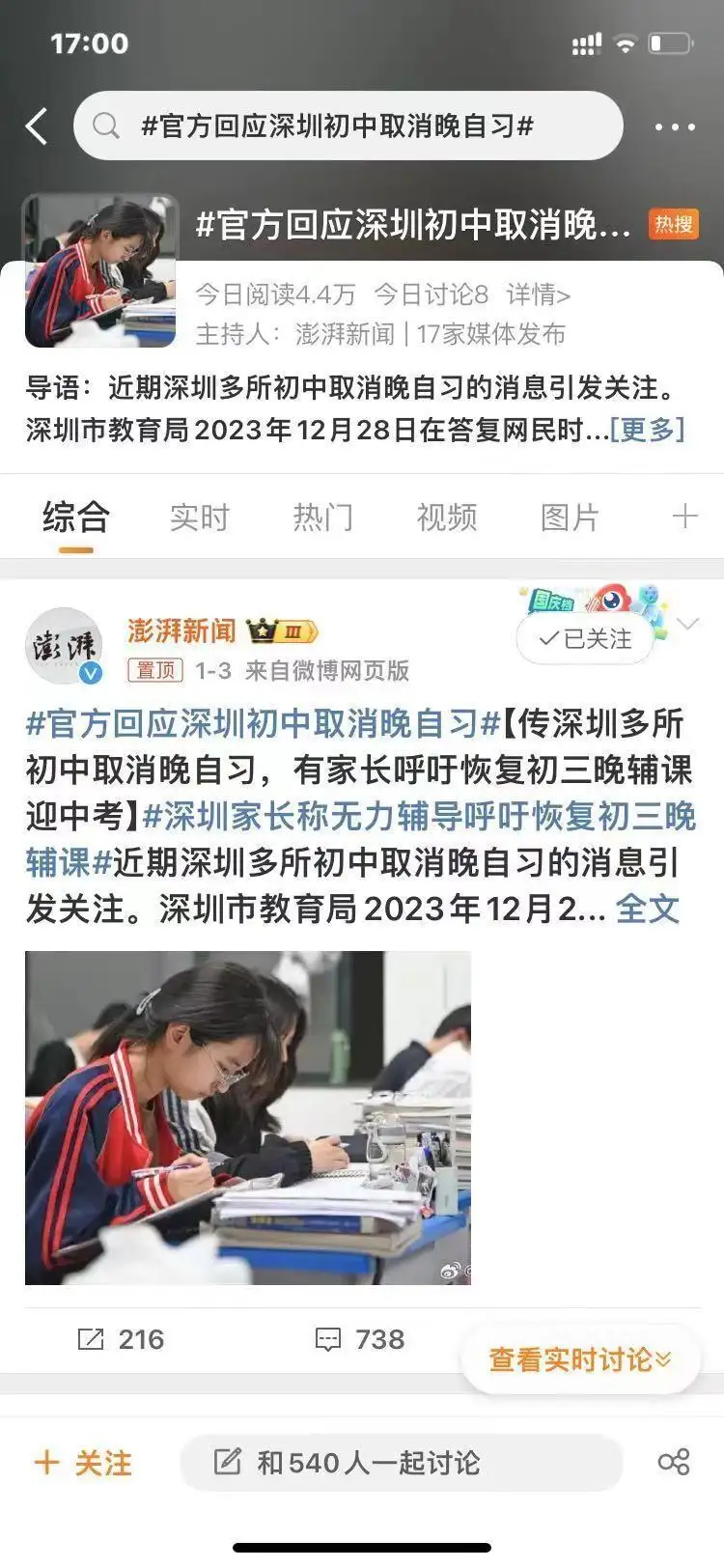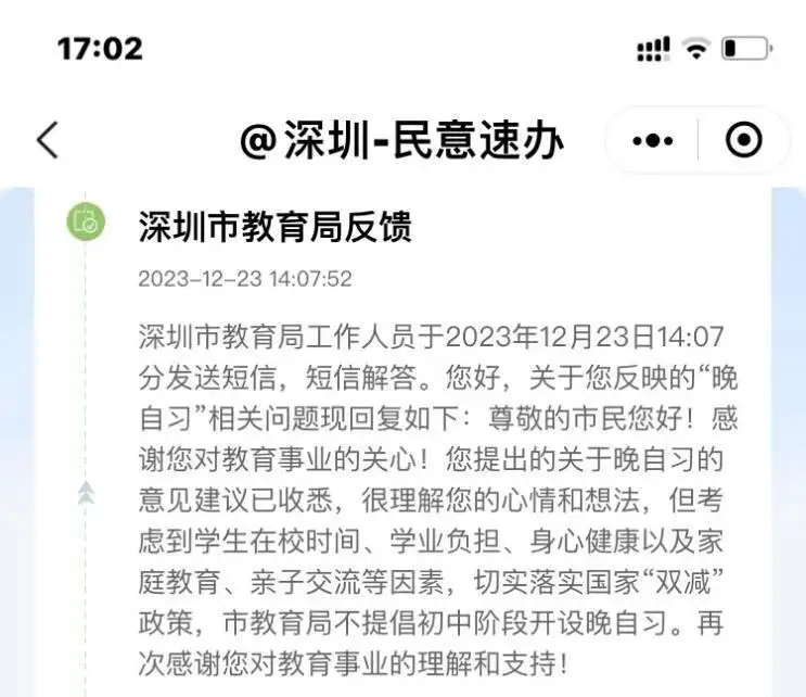 新年伊始,一则关于“深圳初中取消晚自习”的消息引起广泛关注,并迅速登上同城热搜榜。有关此消息,深圳民意速办平台上深圳市教育局官方回复:考虑到学生在校时间、学业负担、身心健康以及家庭教育、亲子交流等因素,切实落实国家“双减”政策,深圳市教育局不提倡初中阶段开设晚自习。