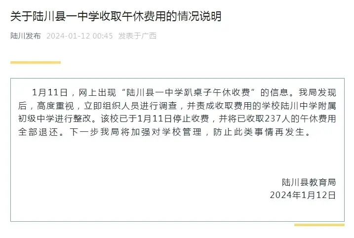 中新网1月12日电 据陆川发布官方微信消息,1月11日,网上出现“陆川县一中学趴桌子午休收费”的信息,陆川县教育局发现后,高度重视,立即组织人员进行调查,并责成收取费用的学校陆川中学附属初级中学进行整改。该校已于1月11日停止收费,并将已收取237人的午休费用全部退还。下一步,陆川县教育局将加强学校管理,防止此类事件再发生。