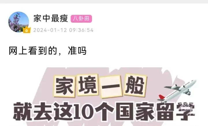 网友“家中最瘦”今天在橙柿互动App留学论坛发帖,家境一般的孩子,去这10个国家留学,靠谱吗?