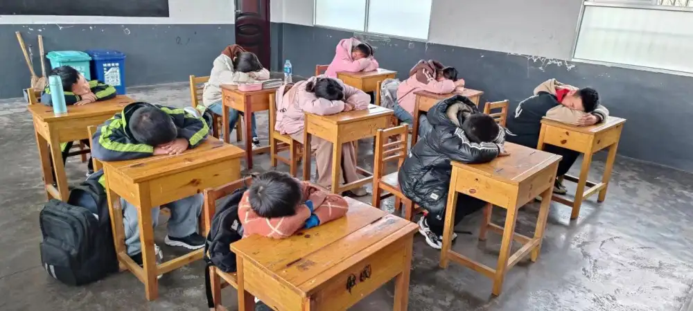 学生趴在木桌上休息(龙强军供图)
