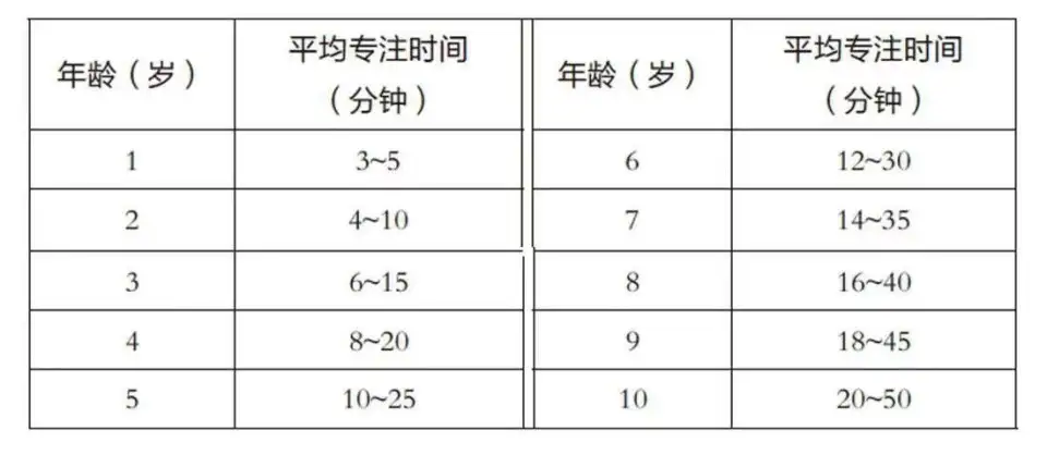孩子能集中注意力的时间,会以每年延长2-5分钟的速度不断增加。不同阶段的孩子,他专注的时间不同。