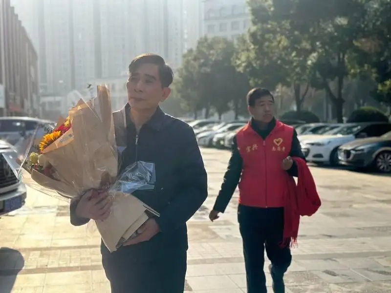 1月12日,王志强的家人崔文炳(左一)手捧鲜花迎接他回家。