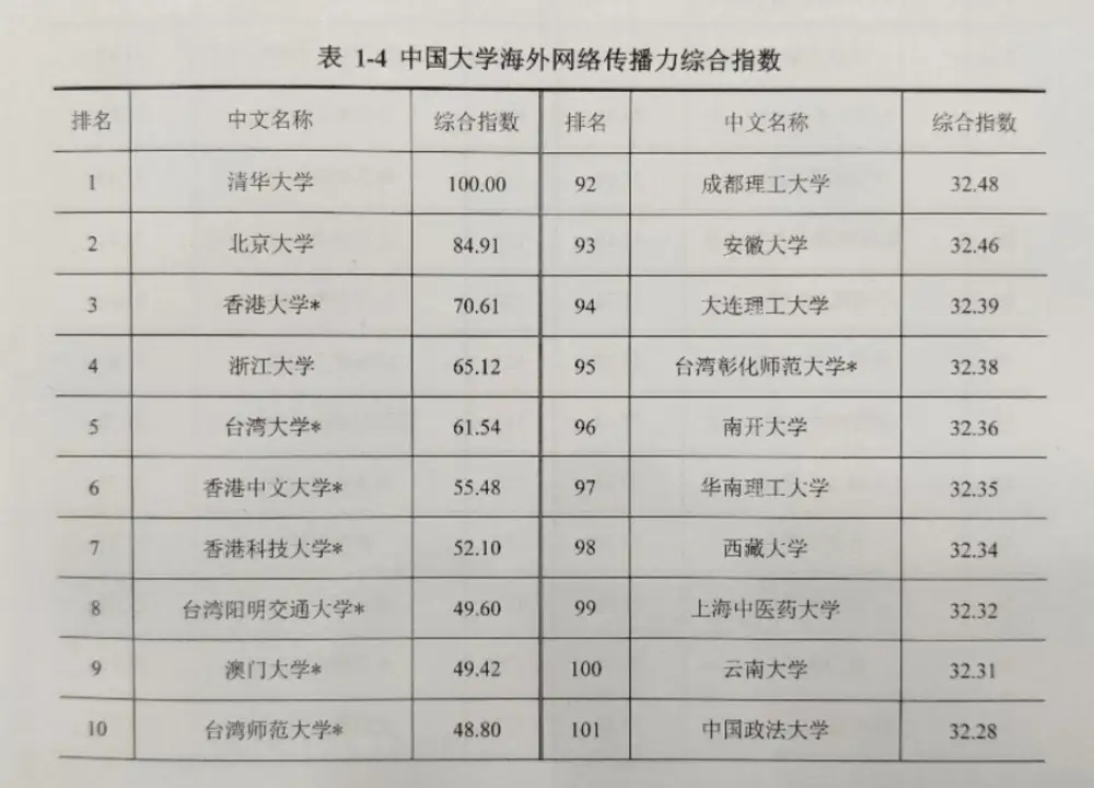 《报告》显示,2023年中国大学的海外网络传播力综合指数排名靠前的依次是清华大学、北京大学、香港大学、浙江大学、台湾大学、香港中文大学、香港科技大学、台湾阳明交通大学、澳门大学和台湾师范大学。