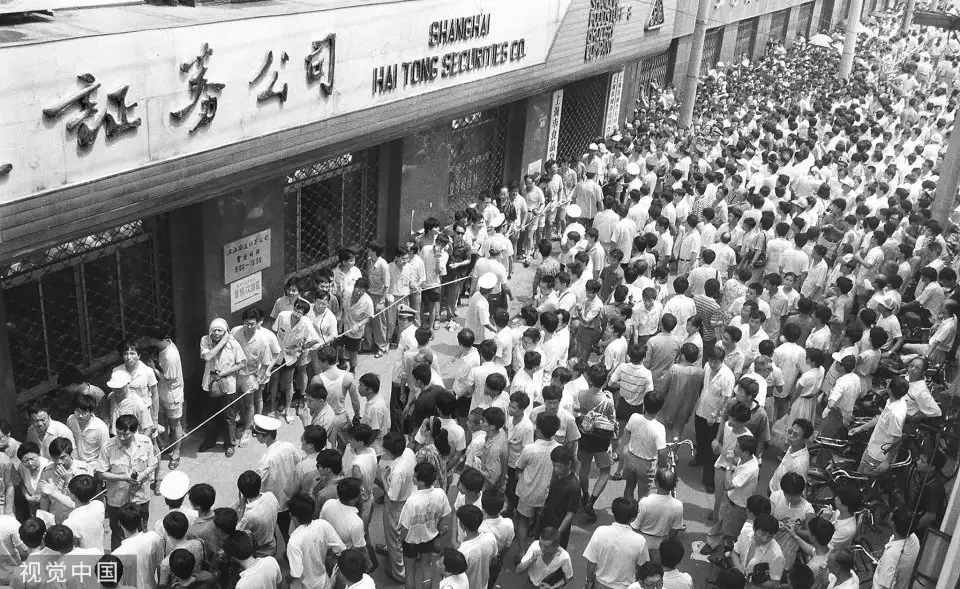 1992年6月8日,上海市中心一家证券公司前,人气旺盛的股民。当时,由于取消部分个股涨跌价格限制不久,股市十分红火。