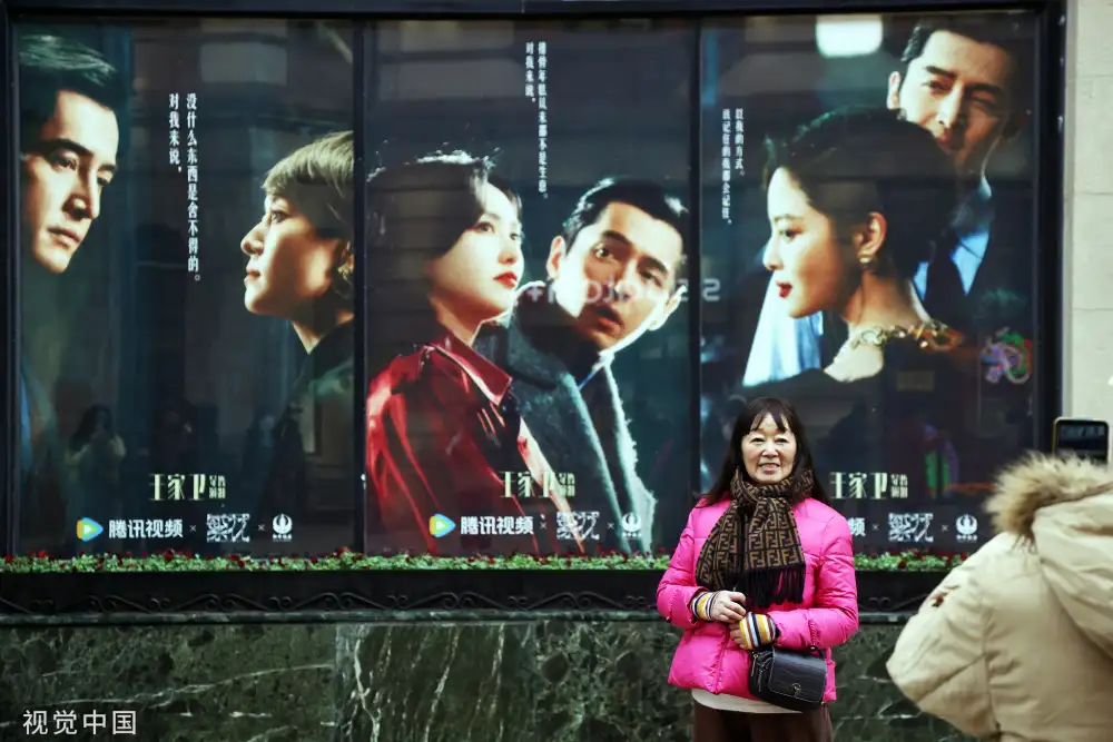 上海市民在黄河路和《繁花》海报合影
