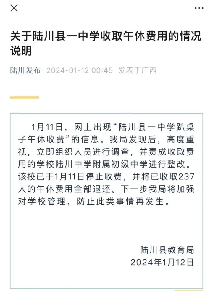 面对汹汹舆情,陆川县教育局立即组织人员进行调查,并发布了相关情况说明,表示已责成收取费用的陆川中学附属初级中学进行整改。目前,该校已停止收费,并将已收取237人的午休费用全部退还。下一步将加强对学校管理,防止此类事情再发生。
