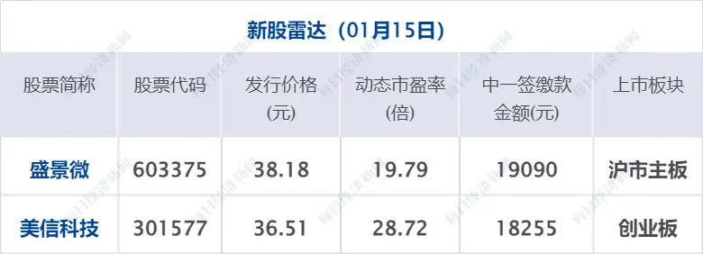 Wind数据显示,本周(1月15日-1月19日)将有3只新股发行,其中沪市主板有2只,创业板有1只。具体来看,1月15日发行的是盛景微、美信科技;1月19日发行的是北自科技。