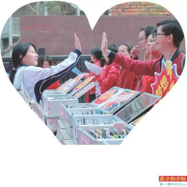 送考老师举着“梦想成真”打气牌,与考生击掌。 学校供图