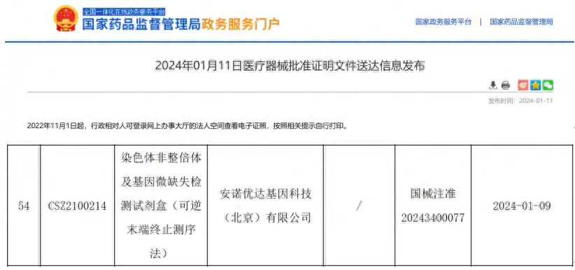 (人民日报健康客户端记者 赵苑旨 谭琪欣)1月11日,国家药品监督管理局消息,安诺优达基因科技(北京)有限公司的染色体非整倍体及基因微缺失检测试剂盒(CNV-seq检测试剂盒)获批上市。这是中国首个基于二代测序方法学、产前“染色体非整倍体及基因微缺失”的检测试剂盒。