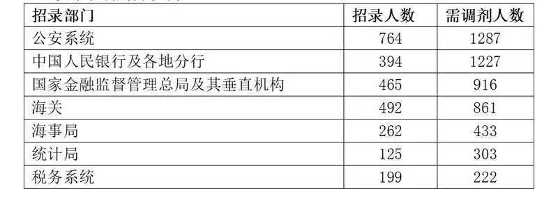 根据2024国考调剂职位表中的信息,调剂需求最多的是公安系统(含铁路公安),需求总人数达到1287人,位居首位,中国人民银行及各地分行紧随其后,需要调剂人数仅比位列首位的公安系统少60人。国家金融监督管理总局、证监会等部门还有专业科目笔试,专业科目笔试成绩必须达到45分才能参加调剂。