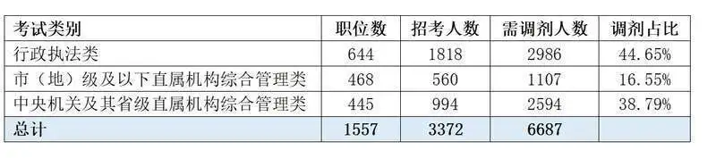 根据中公教育提供的统计数字,2024年国考三类试卷均有调剂需求,副省及以上机关调剂数量最少,主要集中在行政执法类,调剂需求量最大,需调剂2986人,占总调剂人数的44.65%,市(地)级及以下直属机构综合管理类职位紧随其后,需调剂2594人,占总调剂人数的38.79%。