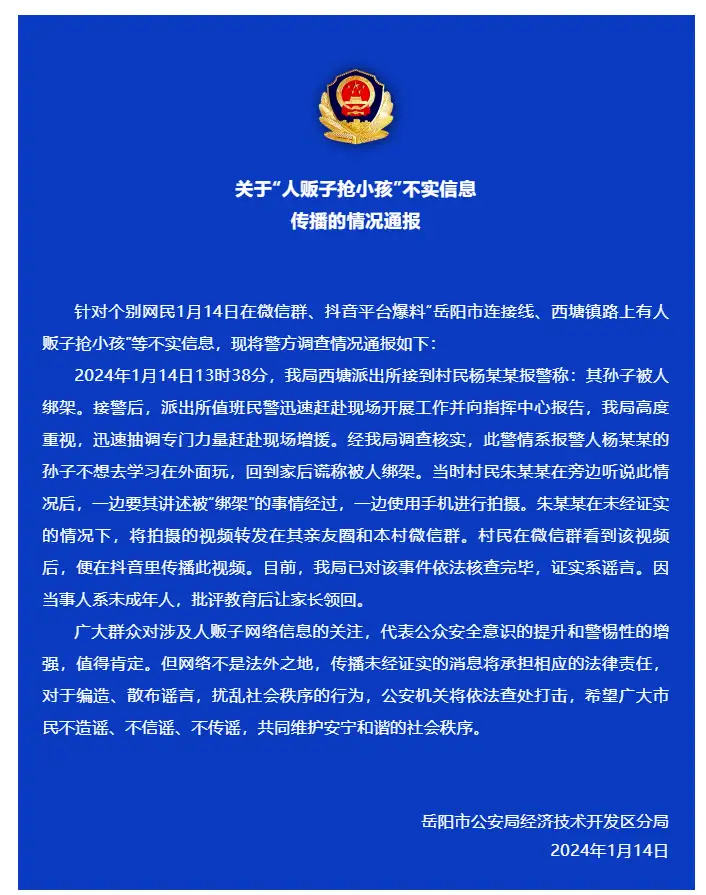 1月14日,岳阳市公安局经济技术开发区分局发布情况通报。针对个别网民1月14日在微信群、抖音平台爆料“岳阳市连接线、西塘镇路上有人贩子抢小孩”等不实信息,现将警方调查情况通报如下: