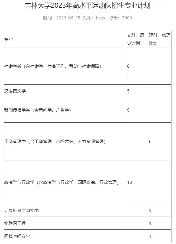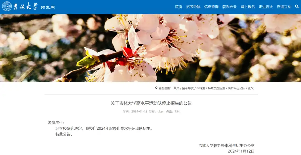吉林大学招生网消息,1月12日,吉林大学教务处本科生招生办公室发布《关于吉林大学高水平运动队停止招生的公告》: