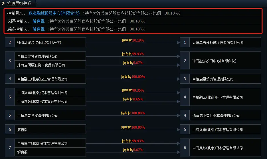 据界面新闻,美吉姆与*ST天山同属于“中植系”上市公司。截至2023年9月底,穿越股权结构可知,美吉姆的控股股东为珠海融诚投资中心(有限合伙),后者持有前者30.18%股权。