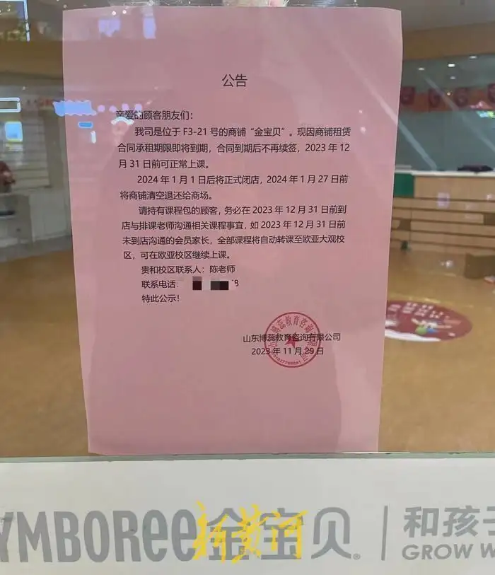 公告显示,对于仍有课程包的顾客,要求在2023年12月31日前,到店与排课老师沟通相关课程事宜,如2023年12月31日前未到店沟通的会员家长,全部课程将自动转课至金宝贝欧亚大观校区,可在欧亚校区继续上课。公告落款为山东博蕊教育咨询有限公司。