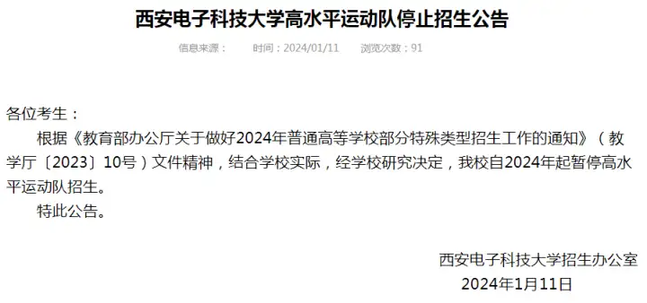 近日,教育部阳光高考信息平台更新多所大学2024年特殊类型招生动态。记者注意到,今年起,哈尔滨工业大学、电子科技大学、南京航空航天大学等高校停止高水平运动队招生: