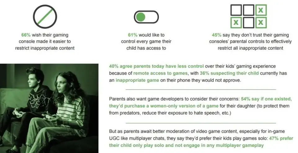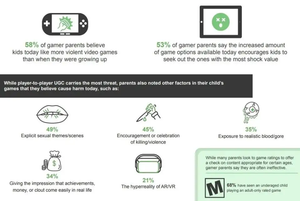 调查显示,前文所述的写实暴力、未经监管的负面UGC内容与有害的语音监管成了新生代游戏玩家父母最为忌惮的负面因素。不少家长甚至坦言,自己并不会让年轻时的自己游玩今天孩子们能够游玩到的电子游戏。