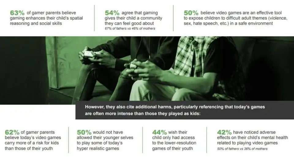 有62%的家长认为,如今的电子游戏比他们年轻时的电子游戏对孩子来说有着更高的危害,而50%的家长不会让从前的自己游玩他们今天正在玩的游戏。44%的家长十分希望自己的孩子只能玩那些分辨率较低的游戏。