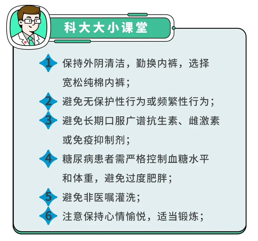 消除诱因,及时停用抗生素或激素药物,积极治疗糖尿病,勤换内裤,用过的毛巾等生活用品进行开水烫洗。