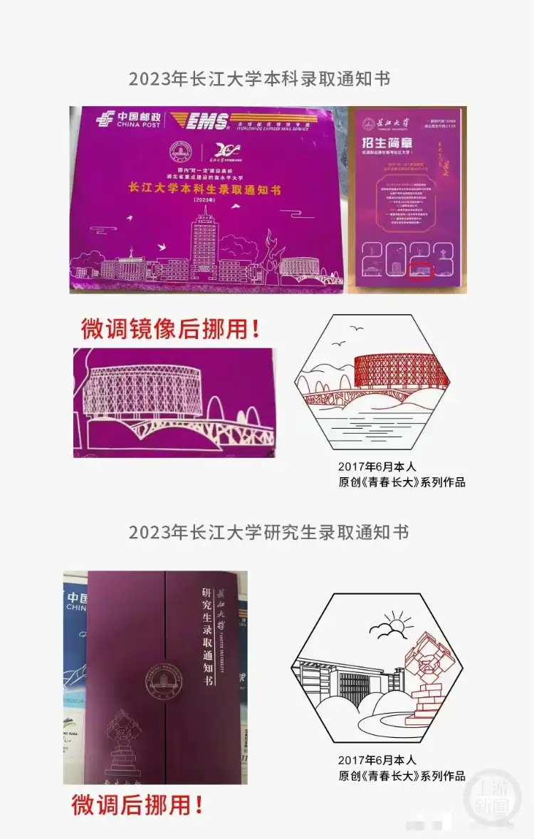 该网友自称是一名视觉设计师,他晒出了2020-2023年这四年长江大学的本科录取通知书,以2020年的录取通知书为例,该网友表示正面下方的学校剪影素材,实际上是自己2017年6月在系列作品《青春长大》中原创的,但被微调后直接挪用;随后3年的本科录取通知书上,也或多或少地直接用了自己的素材。此外,2023年长江大学海内网青年学者论坛的宣传素材,以及学校发行的纪念版校徽,均使用了他的原创素材。