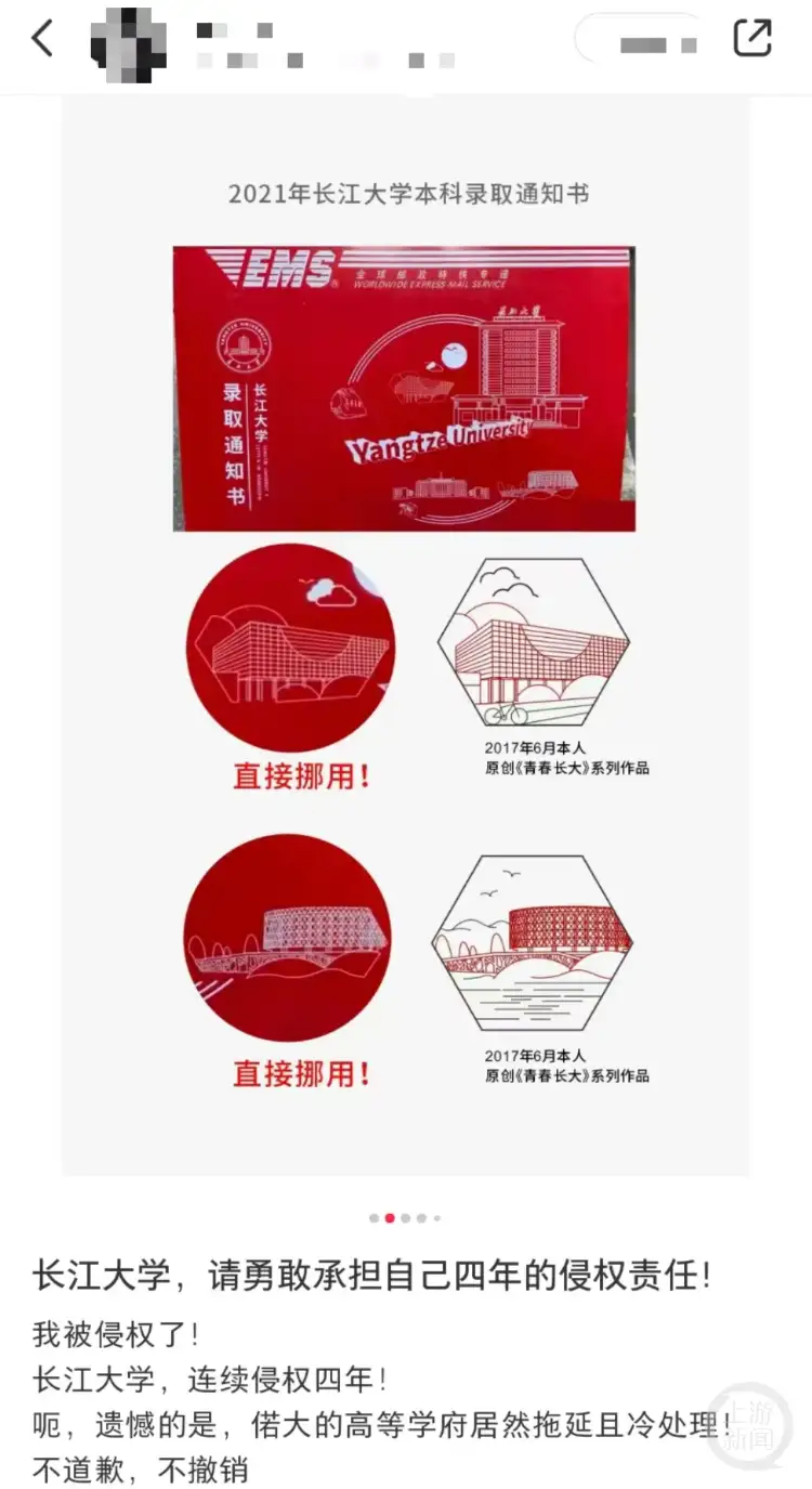 近日,一名设计师在社交平台上发帖,称自己的设计作品近年内多次被长江大学侵权盗用,最近4年的该校本科录取通知书封面和背面,不同程度地盗用了自己的设计作品。该设计师告诉上游新闻(报料邮箱baoliaosy@163.com)记者,目前事情正在处理中,学校正在和自己的律师在协商。