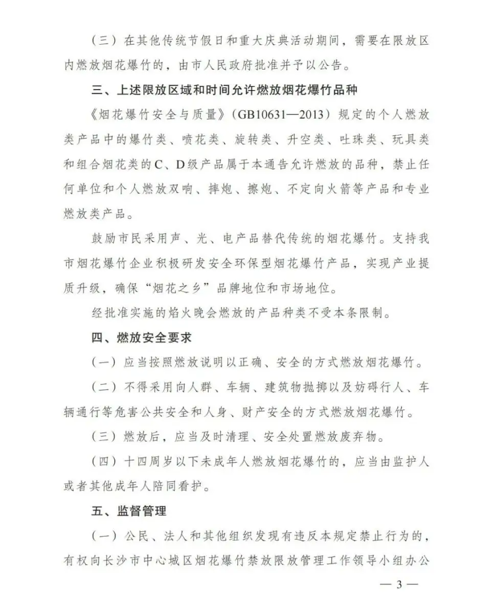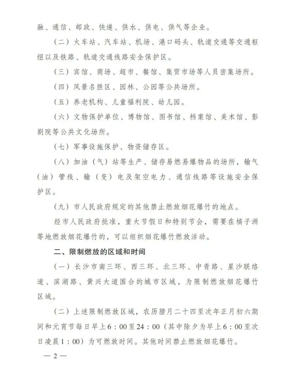 长沙市南三环、西三环、北三环、中青路、星沙联络道、滨湖路、黄兴大道围合的城市区域,为限制燃放烟花爆竹区域。上述限制燃放区域,农历腊月二十四至次年正月初六期间和元宵节每日 6︰00 至 24︰00 (其中除夕为6︰00 至次日凌晨 1︰00) 为可燃放时间。其他时间禁止燃放烟花爆竹。
