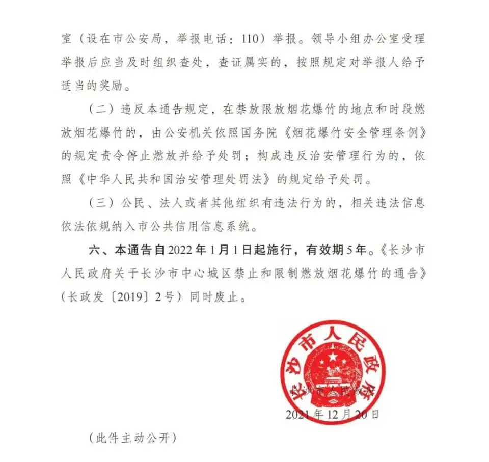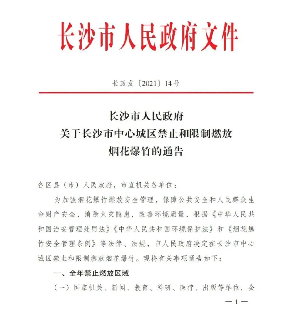附长沙市人民政府关于长沙市中心城区禁止和限制燃放烟花爆竹的通告