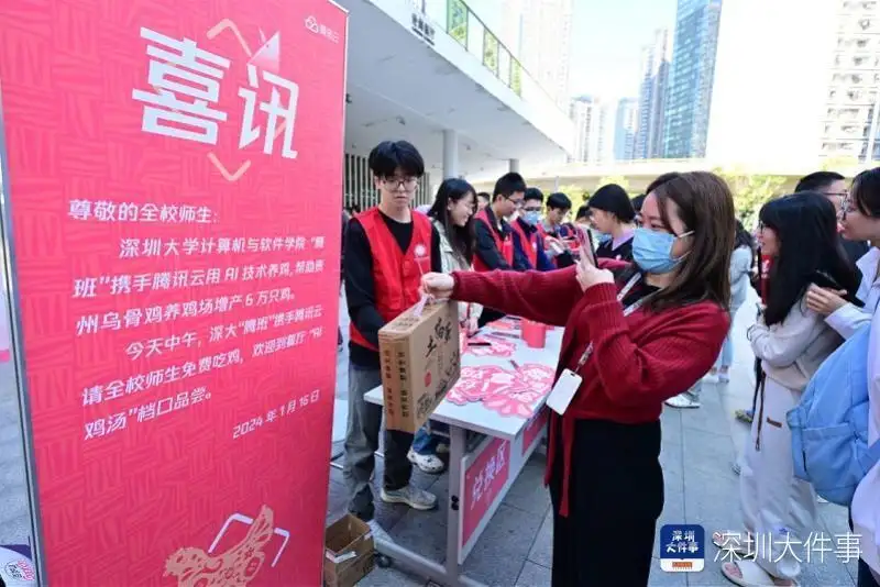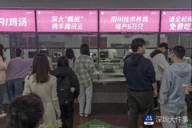 1月16日,深圳大学的食堂里多了几个“AI鸡汤”的档口。显眼的“免费吃鸡”招牌下,排队的师生甚至站到了食堂门外。这些档口后厨的每一只鸡,都是深圳大学腾讯云人工智能特色班(简称“腾班”)的00后大学生们用AI“养”的。