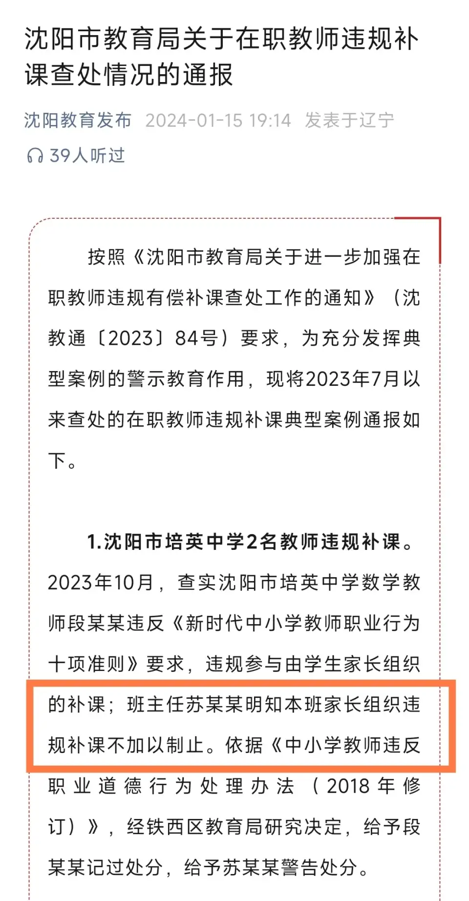 1月15日,沈阳市教育局通过官方微信公众号,通报了6起在职教师违规补课典型案例,17名教师被处分。其中,沈阳市培英中学的一名苏姓老师,因“明知本班家长组织违规补课不加以制止”的问题,被警告处分,处分理由是该名老师《中小学教师违反职业道德行为处理办法(2018年修订)》。