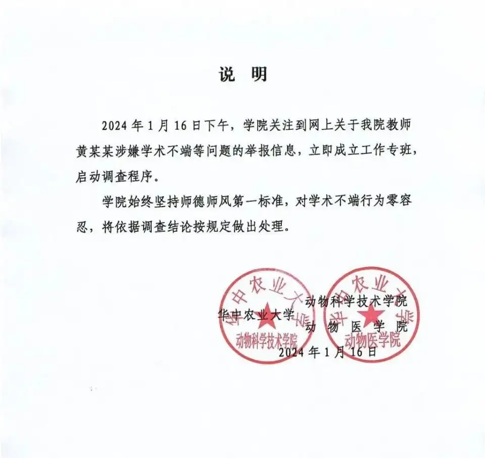 当晚,华中农业大学动物科学技术学院、动物医学院在官网发布说明称,1月16日下午,学院关注到网上关于该院教师黄某某涉嫌学术不端等问题的举报信息,立即成立工作专班,启动调查程序。学院始终坚持师德师风第一标准,对学术不端行为零容忍,将依据调查结论按规定做出处理。