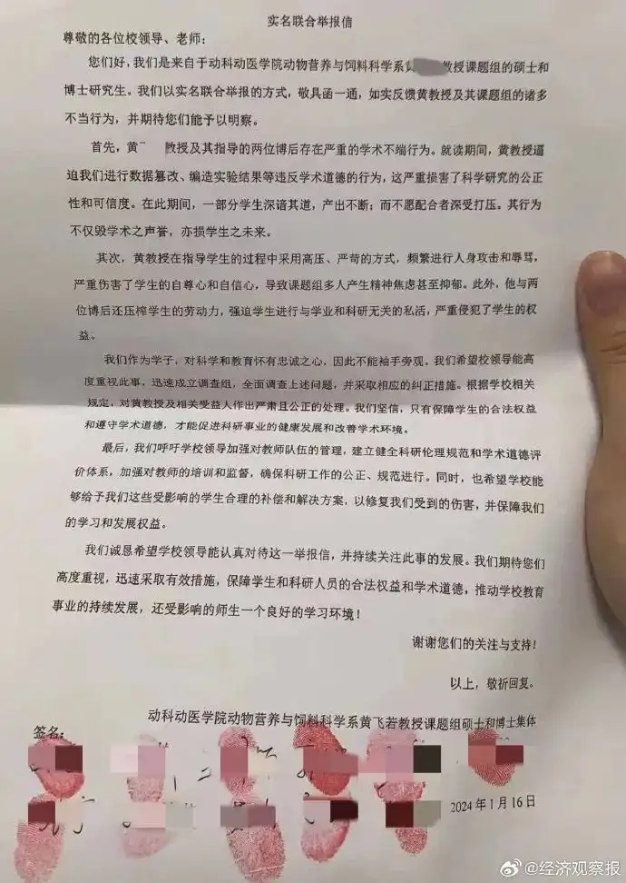 1月16日,有网友晒出华中农业大学多名学生签名并印上手印的举报信,信中列举了其导师黄教授数据篡改、编造实验结果等学术不端行为。