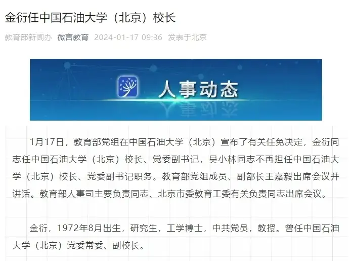 新京报讯 据微言教育微信公众号消息,1月17日,教育部党组在中国石油大学(北京)宣布了有关任免决定,金衍同志任中国石油大学(北京)校长、党委副书记,吴小林同志不再担任中国石油大学(北京)校长、党委副书记职务。教育部党组成员、副部长王嘉毅出席会议并讲话。教育部人事司主要负责同志、北京市委教育工委有关负责同志出席会议。