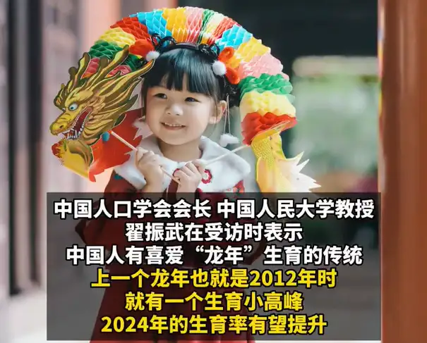 中国人口学会会长、中国人民大学教授翟振武表示,中国人有喜爱“龙年”生育的传统,2024年的生育率有望提升。而应对“少子老龄化”问题,需构建起生育支持政策体系的“四梁八柱”。翟振武说:“2024年是龙年,中国人对生肖偏好非常明显,上一个龙年也就是2012年时就有一个生育小高峰。综合来看,2024年的生育率有望提升。”