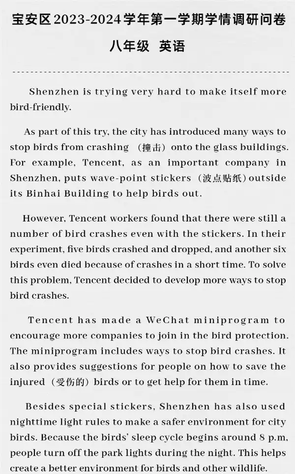 今日,“腾讯”公众号发文,晒出了深圳市宝安区八年级的英语试卷,腾讯大楼“贴膜”防鸟撞改造项目登上试卷。