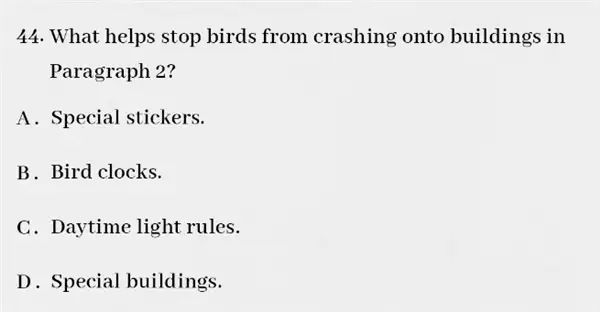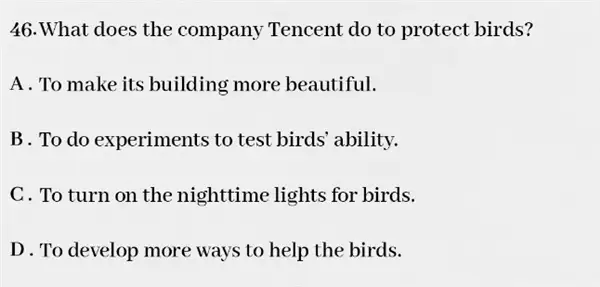 据了解,题目为阅读理解,问题包括“第二段中,是什么帮助鸟类撞上建筑物”“在腾讯的实验中提到了多少只鸟类”“腾讯在保护鸟类方面做了什么?”等等。